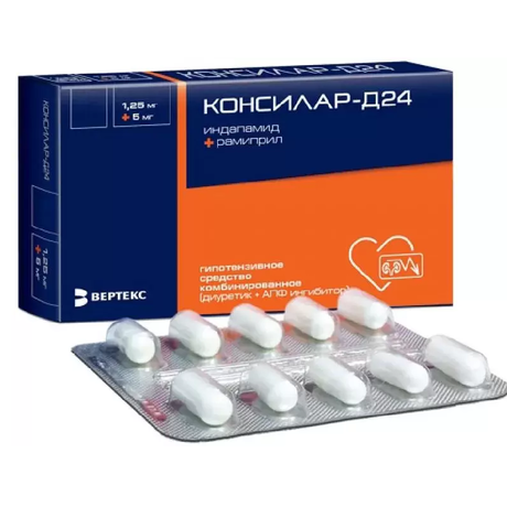 | Консилар-Д24 | Капс. 0.625 мг+2.5 мг: 10, 14, 20, 28, 30, 50, 56 или 60 шт. рег. №: ЛП-003649 от 20.05.16 *- Действующее* Дата перерегистрации: 21.05.21 | |