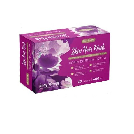 Кожа Волосы Ногти MultiForte Витаминный комплекс: Показания Рекомендуется в качестве биологически активной добавки к пище - источника меди, марганца, дополнительного источника железа, йода, селена, цинка, витаминов А, Е, С, В3, В5, В6, В1, В2, Д3, В9, В12, биотина, обеспечивающей ежедневное питание для кожи, волос и ногтей, способствующей восполнению недостатка витаминов и микроэлементов; способствующей обновлению клеток кожи и повышению ее упругости, выравниванию тона кожи, придающей коже сияющий и здоровый вид; активные вещества в составе способствуют приданию блеска волосам, профилактике ранней седины, активизации обменных процессов в волосяных луковицах, помогают повысить прочность волос и ногтей, укрепляют и ускоряют их рост; витаминный комплекс оказывает активное антиоксидантное действие, способствует сдерживанию процессов старения кожи, волос и ногтей.