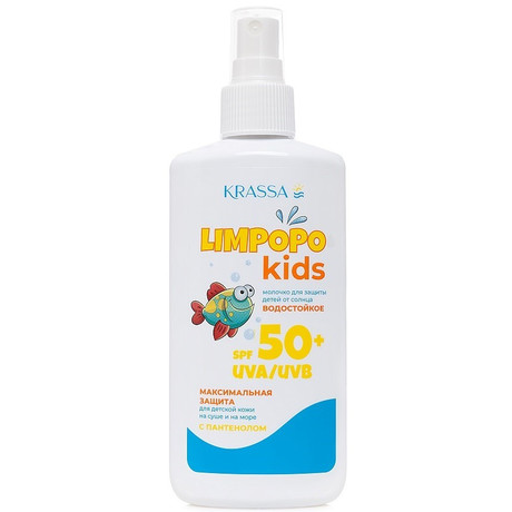 Молочко для защиты детей от солнца Krassa Limpopo Kids SPF 50+ Внешний вид: Однородная эмульсия белого цвета без запаха. Специальные особенности: БЕЗ ОТДУШЕК И ПАРАБЕНОВ Максимальная степень защиты детской кожи от опасных УФ-лучей и солнечного воздействия достигнута комбинацией эффективных UVA/UVB-фильтров. Пантенол, витамин E и аллантоин, входящие в состав, оказывают благоприятное воздействие на кожу ребенка, восстанавливая после загара и защищая от пересушивания. Нежная текстура, легко впитывается.