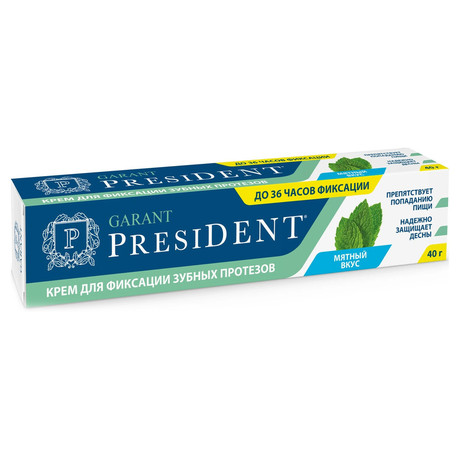 PRESIDENT Крем Гарант для фиксации зубных протезов - кремообразная консистенция, цвет розовый, мятный запах. Длительная фиксация до 36 часов. Специальный крем облегчает адаптацию и обеспечивает надежную защиту десен при ношении зубных протезов.