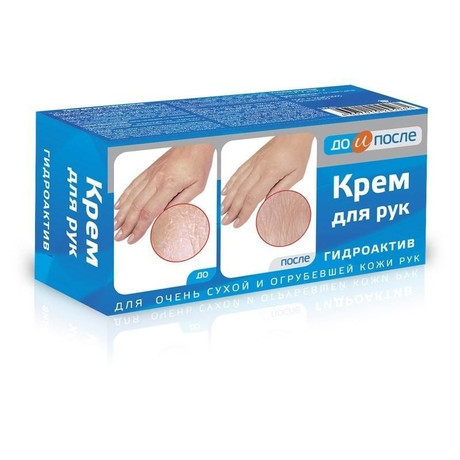 Другие формы «Крем ДО И ПОСЛЕ д/рук»Крем для рук ГИДРОАКТИВ просто незаменим, если вас тревожит сильное обезвоживание и сухость кожи рук, он обеспечит как и мгновенное, быстрое увлажнение рогового слоя эпидермиса, так и длительный эффект увлажнения глубоких слоев кожи.