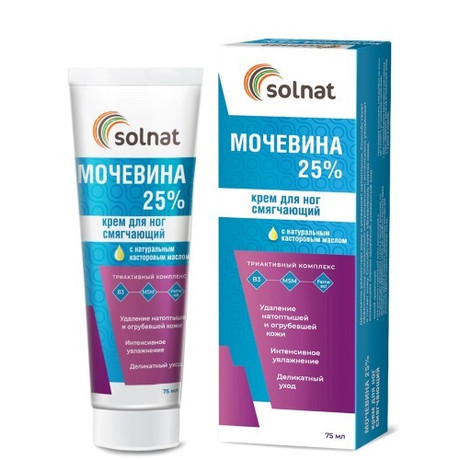 Мочевина 25 % крем для ног смягчающий Solnat. Внешний вид: однородная непрозрачная кремообразная масса холодно-зеленого цвета с характерным цветочно-зелено-травяным запахом. Специальный уход при сухой, огрубевшей коже стоп, трещинах, натоптышах и сухих мозолях. Деликатно размягчает и устраняет натоптыши и мозоли, способствует эффективному заживлению микротрещин. Может использоваться при сахарном диабете. Умная формула крема с высоким содержанием мочевины 25% дополнена натуральным касторовым маслом и высококонцентрированными экстрактами цветков арники и подорожника. Именно это сочетание обеспечивает интенсивный уход за кожей стоп благодаря использованию. В уникальный состав крема МОЧЕВИНА 25% входят никотинамид (витамина В3), метилсульфонилметан и фарнезол, которые в совокупности образуют триактивный комплекс, способствующий ускоренной регенерации проблемных участков кожи, смягчению и питанию кожи.
