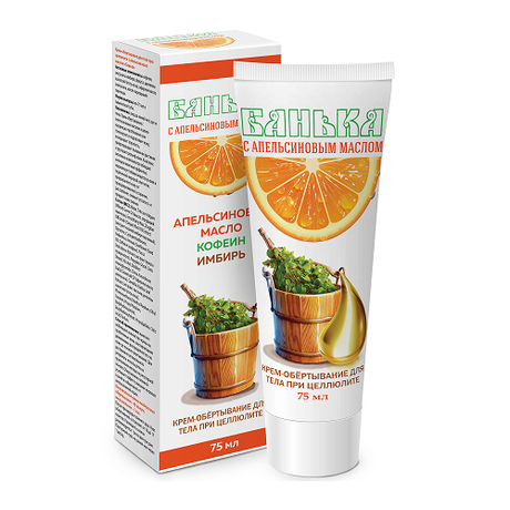 Крем-обёртывание для тела при целлюлите с апельсиновым маслом «Банька» Внешний вид: Однородная масса, не содержащая посторонних примесей, запах апельсиновый, от кремового до светло- желтого цвета. Уход за кожей ног, рук и тела. Крем-обёртывание с апельсиновым маслом в целях коррекции проблемных зон тонизирует и подтягивает кожу, возвращает упругость, предотвращает появление растяжек и улучшает рельеф кожи. Комплекс активных компонентов обладает антицеллюлитным эффектом, нормализует обмен веществ в коже и подкожной жировой клетчатке, предохраняет кожу от преждевременного старения, расслабляет, снимает усталость и придает коже сияние. Результат: Тонизирует и подтягивает кожу, возвращает упругость, предотвращает появление растяжек и улучшает рельеф кожи.