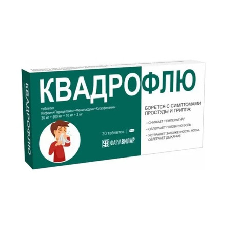 | Квадрофлю | Таб. 30 мг+500 мг+10 мг+2 мг: 10, 20, 30, 40, 50, 60 или 120 шт. рег. №: ЛП-007058 от 31.05.21 *- Действующее* |