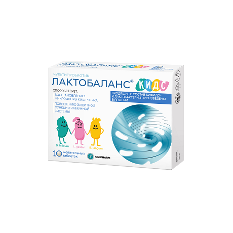 ЛАКТОБАЛАНС КИДС - МУЛЬТИПРОБИОТИК - Биологически активная добавка (БАД) к пище - вкусный пробиотик в удобной жевательной форме для детей с 3-х лет Сбалансированная комбинация 3-х штаммов пробиотических микроорганизмов (бифидо- и лактобактерий), которая способствует поддержанию нормальной микрофлоры кишечника, повышению защитной функции иммунной системы. Каждая таблетка ЛАКТОБАЛАНС® КИДС содержит не менее одного миллиарда пробиотических микроорганизмов (1,0 х 10? КОЕ/таб.): В одной таблетке содержится: Общее количество живых лактобактерий (L. Gasseri KS-13) не менее 7,5 х 10? КОЕ Общее количество живых бифидобактерий (B. Bifidum G9-1, B. Longum MM-2) не менее 2,5 х 10? КОЕ ДРУЖЕСТВЕННОЕ ТРИО ПОЛЕЗНЫХ БАКТЕРИЙ ИЗ ЯПОНИИ Мультипробиотик ЛАКТОБАЛАНС® КИДС содержит 3 штамма живых лиофилизированных бифидо- и лактобактерий, идентичных человеческой микрофлоре, обладающих высокой жизнеспособностью: устойчивых к воздействию желудочного сока, пищеварительных ферментов и желчных кислот. Дружественное трио полезных бактерий произведены в Японии. Данные штаммы характеризуются высокой способностью к адгезии и колонизации на слизистой оболочке кишечника, что создает оптимальные условия для роста нормальной микрофлоры. В состав ЛАКТОБАЛАНС®КИДС входят штаммы с доказанной эффективностью и безопасностью у детей, которые способствуют: • Восстановлению и нормализации микрофлоры кишечника • Подавлению роста патогенных бактерий • Улучшению функционального состояния кишечник • Снижению течения острой диареи и предупреждению возникновения диареи при приёме антибиотиков • Повышению защитной функции иммунной системы ПРОБИОТИКИ - полезные микроорганизмы, оказывающие благоприятное влияние на организм благодаря нормализации состава или повышению активности нормальной микрофлоры кишечника. БИФИДОБАКТЕРИИ - угнетают рост патогенных и условно-патогенных микроорганизмов и создают благоприятные условия для развития нормальной микрофлоры, поддерживают нормальные процессы пищеварения, активизируют иммунные клетки кишечника и способствуют синтезу витаминов группы В. ЛАКТОБАКТЕРИИ - способствуют восстановлению нормальной микрофлоры кишечника. В присутствии лактобактерий снижается концентрация токсинов (аммиака, индола и фенолов)Лактобактерии дополняют позитивное влияние бифидобактерий и способствуют улучшению усвояемости молочных продуктов. Пробиотические микроорганизмы, входящие в состав ЛАКТОБАЛАНС® КИДС: -характеризуются устойчивостью при комнатной температуре; -не требуют хранения в холодильнике; -сохраняют стабильность в течение всего срока годности. Мультипробиотик ЛАКТОБАЛАНС® КИДС не содержит: искусственных консервантов и красителей, производных молока и казеина, поэтому может применяться лицами с непереносимостью лактозы и людьми с аллергией на молочные продукты.