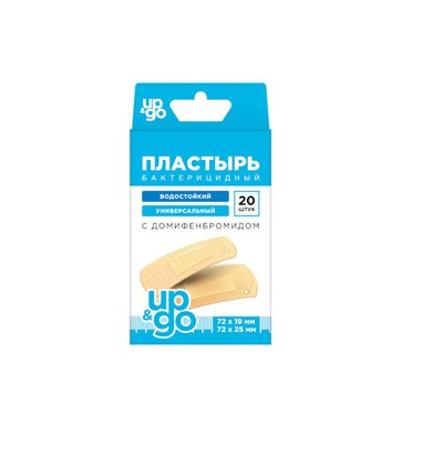 Бактерицидный пластырь Up&Go для небольших повреждений кожи. Благодаря бактерицидной подушечке с содержанием домифенбромида, пластырь обеспечивает ускорение заживления небольших ранок, помогает предотвратить инфекцию.