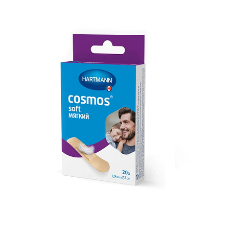 Бренд Cosmos Пластырь Cosmos® soft (МЯГКИЙ), нестерильный, 20 штук в уп. размеры 1,9 см х 7,2 см Пластырь Cosmos® soft мягкий представляет собой неактивное самоклеящееся нестерильное медицинское изделие для однократного использования, состоящее из материала основы и клеевого слоя (материал-носитель) и подушечки, защищенной силиконовым пергамином. Отдельное изделие может оставаться на месте более 1 дня, однако затем должно быть, при необходимости (если изделие загрязняется или отклеивается), удалено и немедленно заменено на новое изделие. Весь период непрерывного использования этих изделий (совокупное использование отдельных изделий, немедленно заменяемых другими изделиями того же типа) составляет менее 30 дней. Пластырь состоит из материала основы и клеевого слоя (материал-носитель), имеется подушечка, защищенная силиконовым пергамином. Основа пластыря: полиэтилен, телесного цвета, марки Alveolit TEE SRZ 10 00.64, производства Sekisui Alveo AG, Швейцария. Клеевой слой: клей на основе прозрачного синтетического каучука Artimelt М11.228, производства Artimelt AG, Швейцария Абсорбирующая подушечка: нетканый материал - вискоза/ полипропилен, марки M 1549 производства Freudenberg Performance Materials SE & Co. KG, Германия. Защитная бумага: силиконовый пергамин, белый, марки (код продукта) 060/ALM40 производства Industrias de Transformacion de Andoain, S.A., Испания.