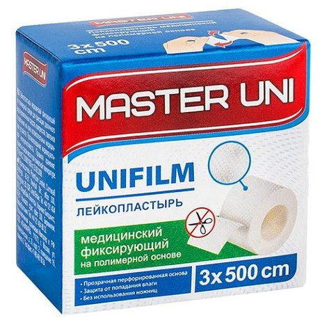Бренд MASTER UNI - большой ассортимент лейкопластырей Линия UNIFILM - фиксирующие лейкопластыри на полимерной основе ЛЕЙКОПЛАСТЫРЬ MASTER UNI UNIFILM МЕДИЦИНСКИЙ ФИКСИРУЮЩИЙ НА ПОЛИМЕРНОЙ ОСНОВЕ Для фиксации различного вида перевязочных средств, компрессов, тампонов и крепления на коже вспомогательных медицинских устройств. Прозрачная перфорированная основа Защита от попадания влаги Без использования ножниц Материал: Полимерный. Цвет: Прозрачный Размеры: 3 см х 500 см