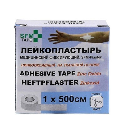 Бренд SFM Пластырь медицинский фиксирующий рулонный цинкооксидный на тканевой основе . • Размер: ширина 1см, длина 500 см • Основа 100% хлопковая ткань • Цвет - белый • Возможно нанесение надписей на поверхность лейкопластыря • Подходит для длительного ношения • Не растягивается • Пропускает воздух и влагу, кожа "дышит" • Не вызывает мацерации • Снимается легко, безболезненно • Не оставляет следов клеевой массы на коже • Катушка в госпитальной картонной упаковке SFM Лейкопластырь фиксирующий медицинский на тканевой основе (хлопковый) гипоаллергенный, универсальный, для нормальной кожи, сильной фиксации, прочный. Крепко держится на коже и легко удаляется, не оставляя на коже следов. Для применения в стационарных и амбулаторных лечебно-профилактических медицинских учреждениях и в домашних условиях. Такие пластыри используются при бытовых порезах, а также при серьезных ранениях.