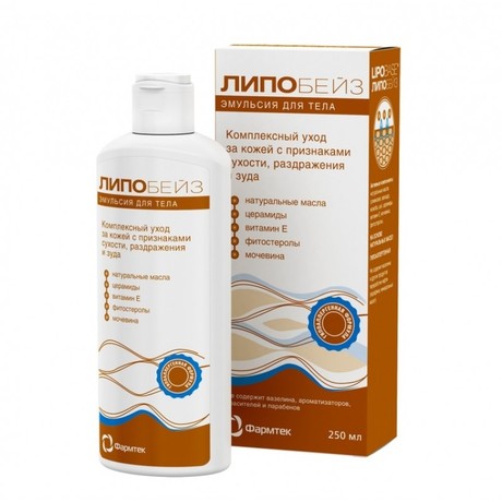 ЛИПОБЕЙЗ ЭМУЛЬСИЯ ДЛЯ ТЕЛА - комплексный уход за кожей при любых состояниях, сопровождающихся сухостью, шелушением, раздражением, зудом Внешний вид и свойства: эмульсия (легкая кремовая текстура), белый цвет, без запаха