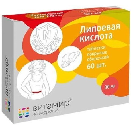ЛИПОЕВАЯ КИСЛОТА - Биологически активная добавка (БАД) к пище - источник липоевой кислоты. Рекомендуемый прием (2 табл.) содержит: Липоевая кислота 60 (±10 %) мг % адекватного уровня суточного потребления 200 1 - согласно «Единым санитарноэпидемиологическим и гигиеническим требованиям к товарам, подлежащим санитарноэпидемиологическому надзору (контролю)» (Глава II, раздел 1, Приложение 5); не превышает верхний допустимый уровень потребления согласно 1. Липоевая кислота благотворно влияет на многие системы организма, избавляя его от свободных радикалов за счет общего антиоксидантного действия. Это вещество регулирует процессы переработки этанола в печени, тем самым поддерживая ее нормальное функционирование, а также уменьшает потребность в витаминах C и E. ИНФОРМАЦИЯ О БИОЛОГИЧЕСКИ АКТИВНЫХ ВЕЩЕСТВАХ И ИХ СВОЙСТВАХ: Липоевая кислота - это органическое соединение, один из важнейших компонентов системы антиоксидантной защиты человеческого организма. По характеру действия она похожа на витамины группы B. Благодаря своим сильным восстановительным свойствам липоевая кислота уменьшает потребность в витаминах C и E, предотвращая их быстрый распад. Она необходима для более быстрой утилизации углеводов, что в свою очередь приводит к улучшенному энергетическому обмену. Липоевая кислота, являясь участником процесса гликолиза, непосредственно участвует в переработке глюкозы в энергию. Кроме того, воздействуя на специальные белки-транспортеры, липоевая кислота способствует уменьшению деградации инсулина, благодаря чему происходит более эффективная утилизация глюкозы. Также она запускает процесс детоксикации в организме. Такой эффект достигается за счет связывания этой кислоты с солями тяжелых металлов с дальнейшим их выведением. Важная функция липоевой кислоты состоит в уменьшении разрушающего воздействия алкоголя на клетки печени за счет участия в реакциях обезвреживания этанола.