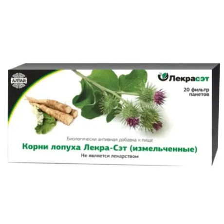 Упаковка и форма выпуска - 20 фильтр-пакетов по 1,5г в уп. Лопуха корни содержат полифруктозаны и органические кислоты.