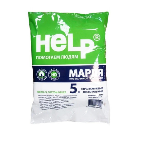 Отрезы марлевые медицинские “HELP” изготовлены из качественной марли повышенной плотности 36 г/м2 в строгом соответствии с ГОСТ 16427-93. Марля обладает высокой прочностью и гигроскопичностью. Применяется для изготовления операционно-перевязочных средств, а также имеет широкое применение в быту. Для упаковки марлевых отрезов используется высококачественный полиэтиленовый пакет, имеющий перфорацию для удобства открывания.