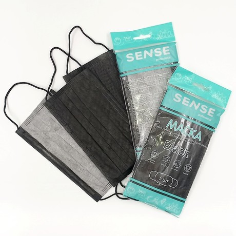 МАСКА МЕДИЦИНСКАЯ ИЗ НЕТКАНОГО МАТЕРИАЛА ОДНОРАЗОВАЯ по ТУ 9398-001-64260744-2010 РУ № ФСР 2010/08512 ТМ SENSE professional. Предназначена для индивидуальной защиты в быту, в местах повышенного скопления людей, в больницах, родильных домах, стоматологических, косметических клиниках и др. в целях предупреждения распространения воздушно-капельной инфекции. Маска медицинская SENSE professional с высоким уровнем защиты от инфекций, передающихся воздушно- капельным путём. ТЕХНИЧЕСКИЕ ХАРАКТЕРИСТИКИ: • Изготовлены из высококачественного синтетического нетканого материала. • Трехслойные. • Снабжены антибактериальным фильтром (лицевой слой), который изготовлен из 100% полипропилена, в т.ч. выдувного способа производства - «СМС». Обладает хорошей воздухопроницаемостью, не накапливает статического электричества, не прозрачен, мягкий и не раздражает кожных покровов. • Имеют усовершенствованную форму с тремя складками, направленными вниз. • Произведены с использованием уникальной соединительной технологии, при которой предусматривается мощная прокатка трех слоев мягких и гибких материалов, что устраняет грубость и неудобства традиционных методов соединения материалов (склеивание, нагрев, сшивание и т.п.). • Гибкий носовой фиксатор в верхней части маски обеспечивает подбор индивидуальной формы, лучшее прилегание к лицу и защиту. • Удобство использования благодаря мягким круглым ушным резинкам. • Не препятствуют свободному дыханию. • Обладают высокой воздухопроницаемостью (не менее 200 дм3/м2 х с). • Реакция водной вытяжки (рН) 6,7+-0,1 (Нейтральный) Цвет: Чёрный (внешний и средний слои), лицевой белый слой - для обеспечения гигиеничности при контакте с лицом. Размер 17,5*9,5 (± 0,5) см