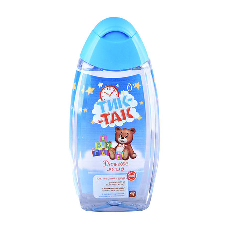 Детское масло "Тик-Так" предназначено для проведения профилактического массажа и для смягчения кожи младенцев после гигиенических процедур. Детское масло -многофункциональное средство по уходу за чувствительной кожей ребенка с первых дней жизни. Масло содержит экстракты ромашки, календулы и витамин Е. Рекомендуется детям любого возраста, а также подходит взрослым. Для наружного применения.
