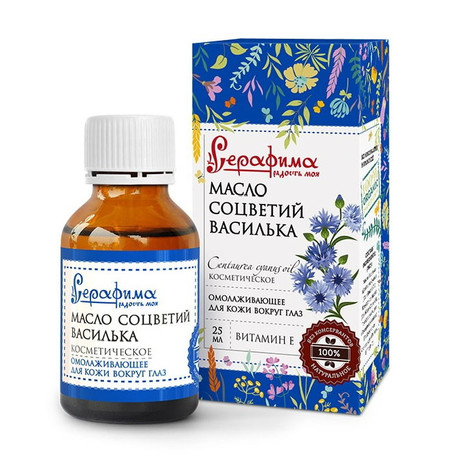 Другие формы «Масло натуральное СЕРАФИМА»Масло василька подходит для ухода за кожей вокруг глаз. Эффективно разглаживает мелкие морщинки, ухаживает за тонкой кожей век, восстанавливает упругость, улучшает цвет лица, улучшает тонус дряблой, сухой кожи лица, шеи и области декольте. Помогает окрашенным волосам дольше сохранить яркий цвет волос.