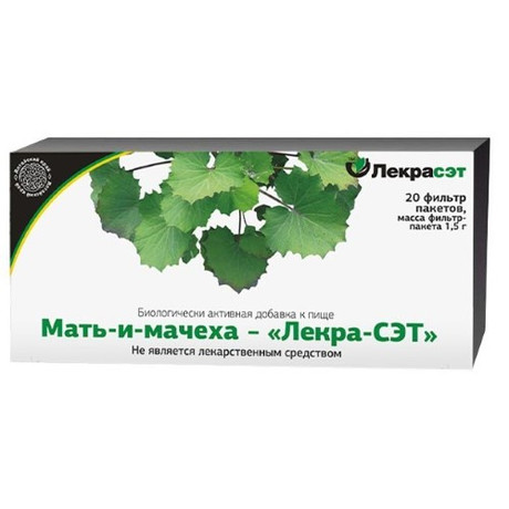 МАТЬ-И-МАЧЕХА-ЛЕКРА-СЭТ - Биологически активная добавка (БАД) к пище РЕКОМЕНДАЦИИ в НАРОДНОЙ МЕДИЦИНЕ Мать-и-мачеху используют как противовоспалительное, разжижающее мокроту и отхаркивающее средство при лечении бронхопневмонии, бронхиальной астмы, при хронических бронхитах, при ларингитах и трахеитах. Также это растение обладает лёгким потогонным, спазмолитическим и желчегонным свойствами. В народной медицине мать-и-мачеху применяют и при воспалительных заболеваниях желудка, кишечника, почек и мочевого пузыря. Наружно мать-и-мачеху применяют для лечения инфицированных ран, язв, нарывов, фурункулов (настоем делают обмывания, прикладывают свежие размятые листья), полощут горло при ангине. При воспалительных заболеваниях влагалища, сопровождающихся белями делают спринцевание. При выпадении волос, перхоти, при чесании кожи головы настоем моют голову.
