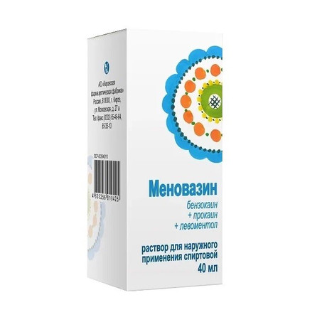 | Меновазин | Р-р д/наружн. прим. (спиртовой) 1 г+2.5 г+1 г/100 мл: 40 или 50 мл фл. рег. №: ЛСР-003640/10 от 30.04.10 *- Бессрочно* |