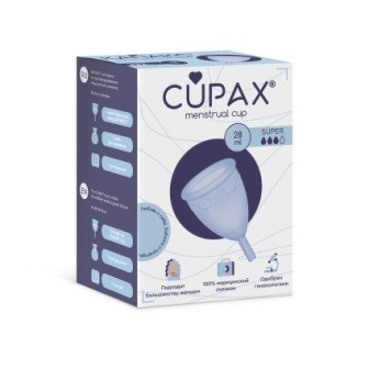 Выпускается в двух размера (Regular 22 мл, 2 капли и Super 28 мл, 3 капли): CUPAX SUPER: идеально подходит для рожавших женщин или женщин с нормальными и обильными менструациями. CUPAX REGULAR: идеально подходит для нерожавших женщин или девушек с нормальными и скудными менструациями.