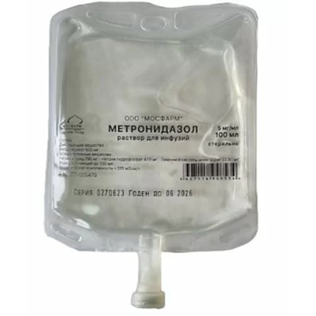 При в/в введении 500 мг в течение 20 мин Cmax в сыворотке крови через 1 ч - 35.2 мкг/мл. Концентрация метронидазола в сыворотке крови через 4 ч - 33.9 мкг/мл, через 8 ч - 25.7 мкг/мл; Cmin при последующем введении - 18 мкг/мл. Тmax - 30-60 мин, терапевтическая концентрация сохраняется в течение 6-8 ч. При нормальном желчеобразовании концентрация метронидазола в желчи после в/в введения может значительно превышать концентрацию в плазме.