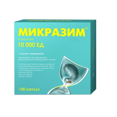 Микразим® - пеллеты панкреатина в капсулах. В состав препарата входят натуральные ферменты из поджелудочной железы животных - протеаза, липаза и амилаза, обеспечивающие переваривание белков, жиров и углеводов пищи.