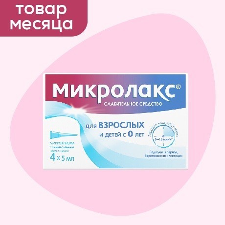 Микролакс® - комбинированный препарат, оказывающий слабительное действие. Эффект наступает через 5-15 мин. В состав препарата входят натрия цитрат (пептизатор, который вытесняет связанную воду, содержащуюся в каловых массах), натрия лаурилсульфоацетат (разжижает содержимое кишечника) и сорбитол (усиливает слабительное действие путем стимуляции поступления воды в кишечник). Увеличение количества воды за счет пептизации и разжижения способствует размягчению каловых масс и облегчает опорожнение кишечника.