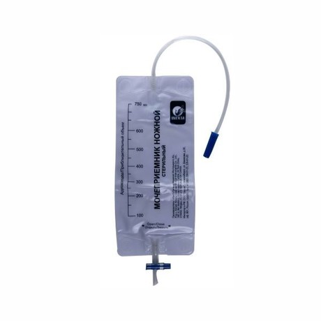 Мочеприемник носимый ножной объемом 750 мл, стерильный, одноразовый, изготовлен из мягкого ПВХ не раздражающего кожу, длина трубки 30±2 см, на конце трубки конической формы коннектор с колпачком, идеально подходящий к любому размеру и типу катетера, снабжен клапаном против обратного тока мочи, Т-образный спускной кран на дне мешка, имеется градуировка, цена деления 50 мл, прилагаются эластичные ленты с застежками, возможность крепления как к бедру, так и к голени, используется как мужчинами, так и женщинами, стерилизован оксидом этилена, срок годности 3 года