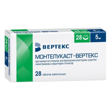 | Монтелукаст-Вертекс | Таб. жевательные 5 мг: 10, 14, 15, 28, 30, 56 или 60 шт. рег. №: ЛП-002862 от 18.02.15 *- Действующее* Дата перерегистрации: 30.11.20 |