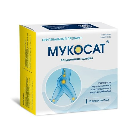| Мукосат® | Р-р д/в/м и внутрисуставного введения 100 мг/1 мл: амп. 1 мл или 2 мл 5, 10 или 25 шт. рег. №: Р N000570/01 от 09.04.08 *- Бессрочно* Дата перерегистрации: 21.05.19 |
