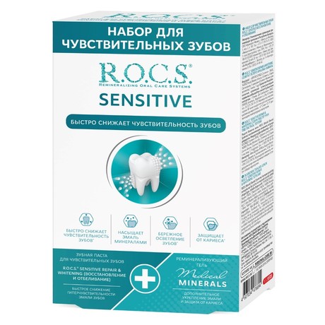 Повышенная чувствительность зубов является одной из актуальных проблем в стоматологии. До 70 % взрослых в европейской популяции страдает от гипечувствительностиэмали и дентина. Неабразивная зубная паста (RDA=40) для быстрого устранения повышенной чувствительности зубов. Разноразмерныечастицы гидроксиапатита, имеющие высокое сродство к тканям зуба, обеспечивают быстрое снижение чувствительности* путем запечатывания мельчайших дефектов эмали и канальцев обнаженного дентина. Дополнительное укрепление эмали и защиту от кариеса обеспечивает уникальный **гель R.O.C.S. Medical Minerals, который является источником легкоусвояемых соединений кальция, фосфора и магния. Благодаря специальным компонентам тонкая невидимая плeнкагеля задерживается на зубах на длительное время, что обеспечивает продолжительное, постепенное проникновение активных компонентов в ткани зуба.