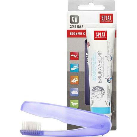 Бренд SPLAT (Сплат) - ведущий разработчик и производитель профессиональных решений в категориях ухода за полостью рта. СПЛАТ PROFESSIONAL НАБОР ДОРОЖНЫЙ ЗУБНАЯ ПАСТА BIOCALCIUM 40МЛ+ЗУБНАЯ ЩЕТКА СКЛАДНАЯ - Картонная упаковка В дорожный набор входит: мини-упаковка (40 мл) зубной пасты СПЛАТ ПРОФЕССИОНАЛ БИОКАЛЬЦИЙ и складная зубная щетка. Внешний вид и свойства: Цвет и форма ручки: разные цвета, округлая. Цвет и жесткость щетины: белая, средняя Восстановление эмали и безопасное отбеливание: Комплексная зубная паста с биоактивным Кальцисом, полученным из яичной скорлупы, и гидроксиапатитом - строительным веществом твердых тканей зуба. Паста предназначена для восстановления эмали и снижения чувствительности зубов. Эффект: Сочетание гидроксиапатита и полученного из яичной скорлупы Кальциса способствует реминерализации эмали. Бикарбонат натрия нормализует рН-баланс полости рта и заботится о здоровье десен. Инновационная система Sp.White system® безопасно отбеливает и полирует эмаль до блеска. Дорожная зубная щетка сочетает привлекательный дизайн и высокую эргономичность. Её удобно хранить: в сложенном виде щетинки закрыты нижней частью ручки, в которой предусмотрены отверстия для вентиляции. Благодаря этому щетина не пачкается и не деформируется в сумке или косметичке. Щетина дорожной щетки самой популярной средней жесткости с утонченными кончиками для максимально эффективного и бережного очищения межзубных промежутков. Подходит даже для чувствительных зубов. Специальные особенности: Без фтора. Результат: Клинически доказано: Реминерализующий эффект - 66,8%; Очищающий эффект - 61,4%; Десенситивный эффект - 55,4%; Отбеливающий эффект - 1,5 тона за четыре недели по шкале VITAPAN.