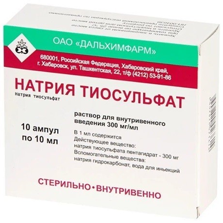 | Натрия тиосульфат | Р-р д/в/в введения 300 мг/мл: 5 мл или 10 мл амп.10 шт. рег. №: ЛП-004638 от 17.01.18 *- Действующее* |