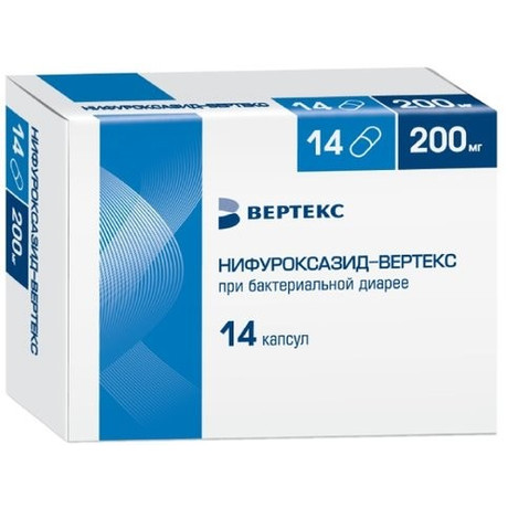 | Нифуроксазид-Вертекс | Капс. 100 мг: 14, 15, 28, 30, 56 или 60 шт. рег. №: ЛП-004463 от 19.09.17 *- Действующее* | |