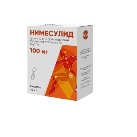 | Нимесулид | Гранулы д/пригот. сусп. д/приема внутрь 100 мг: 2 г пак. 4, 5, 6, 7, 8, 10, 20 или 30 шт. рег. №: ЛП-(000094)-(РГ-RU) от 30.11.20 *- Действующее* |