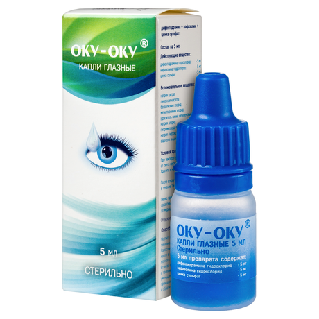 противоаллергическое средство Взаимодействие с другими лекарственными средствами Так как возможно взаимное уменьшение эффектов дифенгидрамина и лекарственных препаратов, стимулирующих центральную нервную систему, не рекомендуется применение препарата ОКУ-ОКУ® у больных, использующих данные препараты. ОКУ-ОКУ® не следует применять одновременно с ингибиторами МАО и в течение 14 дней после прекращения их приема. В результате совместного применения бета-адреноблокаторов, ингибиторов МАО с адреномиметиками, происходит усиление действия последних. Нафазолин замедляет всасывание местноанестезирующих средств, поэтому не рекомендуется совместное применение препарата ОКУ-ОКУ® с местными анестетиками, применяемыми в офтальмологии. Сульфат цинка фармацевтически не совместим с солями серебра, свинца, хинином, ихтиолом, цитралем, протарголом.