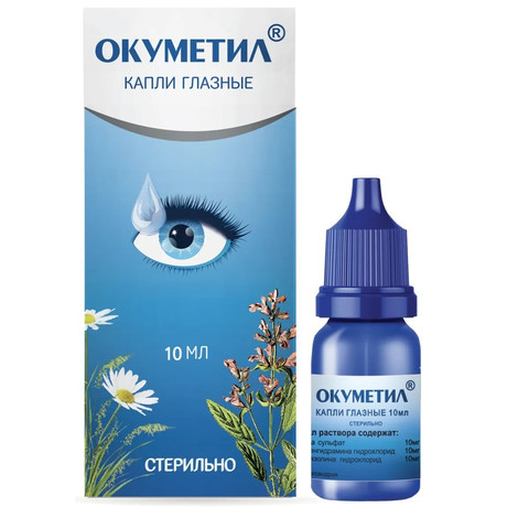 Окуметил является комбинированным препаратом, содержащим цинка сульфат, дифенгидрамин и нафазолин.