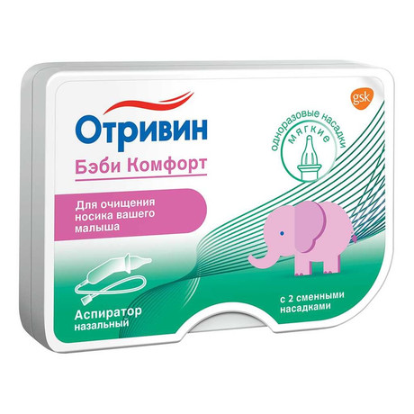ОТРИВИН БЭБИ КОМФОРТ АСПИРАТОР НАЗАЛЬНЫЙ С ДВУМЯ СМЕННЫМИ НАСАДКАМИ (МЯГКИЕ НАСАДКИ) - медицинское изделие, per. удостоверение № ФСЗ 2008/01133 от 24.05.2021. Аспиратор назальный Отривин Бэби Комфорт с двумя сменными насадками предназначен для мягкого удаления слизистых выделений из носа, беспокоящих Вашего малыша при насморке. К аспиратору прилагаются 2 мягкие одноразовые сменные насадки. Перед использованием следует внимательно ознакомиться с информацией на упаковке. Аспиратор прост и гигиеничен в применении. С его помощью можно облегчить носовое дыхание малыша, чтобы он вновь почувствовал себя комфортно. Удаление слизистых выделений способствует предотвращению дальнейших осложнений: ушные инфекции (отит), инфекции пазух (синусит) или кашель. Для облегчения процедуры перед использованием назального аспиратора Отривин Бэби Комфорт рекомендуется промыть нос солевым раствором, например, каплями Отривин Бэби.
