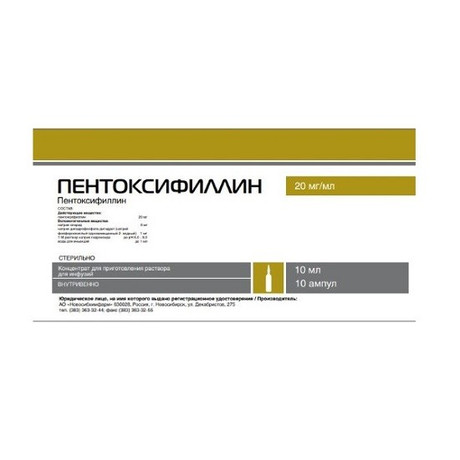 Средство, улучшающее микроциркуляцию, ангиопротектор, производное диметилксантина. Пентоксифиллин уменьшает вязкость крови, вызывает дезагрегацию тромбоцитов, повышает эластичность эритроцитов (за счет воздействия на патологически измененную деформируемость эритроцитов), улучшает микроциркуляцию и увеличивает концентрацию кислорода в тканях. Повышает концентрацию цАМФ в тромбоцитах и АТФ в эритроцитах с одновременным насыщением энергетического потенциала, что в свою очередь приводит к вазодилатации, снижению ОПСС, возрастанию ударного объема крови и минутного объема крови без значительного изменения ЧСС.