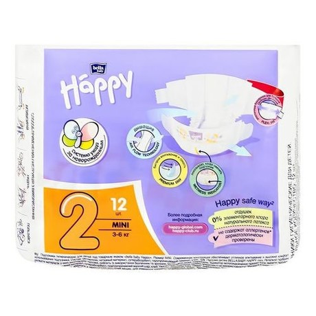 Детские подгузники Happy в размере MINI (2) отлично подойдут для малышей весом от 3 до 6 кг. Теперь с ЭЛАСТИЧНЫМИ БОКОВИНКАМИ, которые обеспечивают лучшее прилегание к телу малыша и более удобное надевание подгузника! Система ухода за новорожденным создана для особо деликатного ухода за самыми маленькими и фокусируется на наиболее важных для данного этапа развития характеристиках: Благодаря дышащему внешнему слою (технология AIR FLOW TECHNOLOGY), подгузник обеспечивает постоянный доступ воздуха к коже малыша, защищая его от опрелостей. Специальный нетканый материал PREMIUM DRY в структуре подгузника ускоряет впитывание и обеспечивает малышу чувство сухости. Подгузники идеально прилегают к телу малыша благодаря широким эластичным боковинкам FLEXI FIT. Индикатор влаги подскажет родителям, когда необходимо сменить подгузник, изменяя цвет с жёлтого на зелёный. Безопасность превыше всего – детские подгузники Happy дерматологически проверены, не содержат хлора и латекса! Без отдушек!
