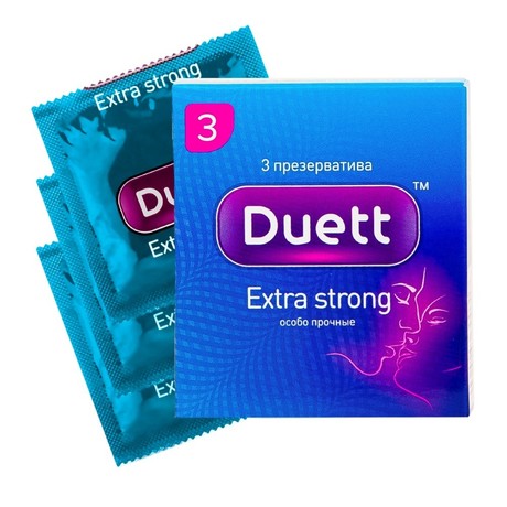 ПРЕЗЕРВАТИВЫ DUETT EXTRA STRONG ОСОБО ПРОЧНЫЕ - особо прочные и надежные презервативы. Благодаря более плотной структуре презерватива позволяют сохранить комфорт обоих партнеров с дополнительной защитой во время интимной близости. Особо прочные презервативы из натурального латекса телесного цвета, с гладкой поверхностью, покрыты силиконовой смазкой с нейтральным ароматом. Три презерватива Duett Extra Strong с накопителем, гладкие, с силиконовой смазкой, с утолщенной стенкой. Смазка не разрушает сперматозоиды. Презервативы Duett™ произведены из натурального латекса. Протестированы электроникой. ХАРАКТЕРИСТИКИ Номинальное количество - 3 шт. Номинальные размеры: Длина - 180 мм. Ширина - 53 мм. +/- 2 мм. Толщина стенки - 0,0100 мм. +/- 0,020 мм.