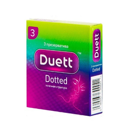 ПРЕЗЕРВАТИВЫ DUETT DOTTED С ТОЧЕЧНОЙ СТРУКТУРОЙ - это выбор уверенного, заботливого человека, именно такого как ты! Ты чувствуешь себя увереннее доставляя удовольствие, теперь это твоя стихия! Кондом не только усиливает возбуждение, но и передает чувственную пульсацию каждой нанесенной точечки. Позволяя увеличить чувствительность при каждом твоем движении. Двигайся навстречу чувствам и покоряй вершины наслаждений! Три презерватива Duett Dotted с точечным рифлением с накопителем, с силиконовой смазкой. Смазка не разрушает сперматозоиды. Презервативы Duett™ произведены из натурального латекса. Протестированы электроникой.