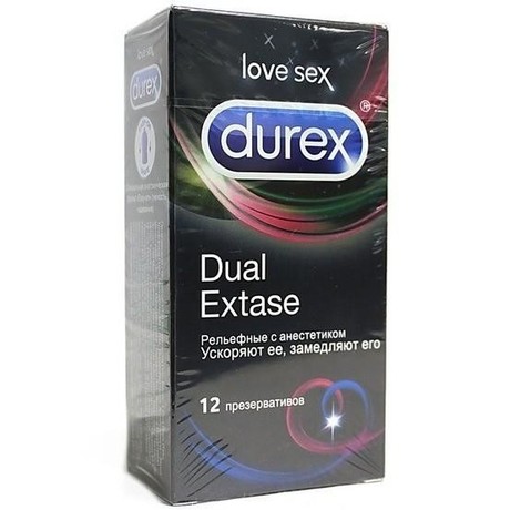 Анестетик (бензокаин) внутри презервативов Durex Dual Extase способен замедлять эякуляцию мужчин, а ребра и пупырышки на поверхности презерватива помогают усилить стимуляцию и ускорить наступление оргазма женщины.