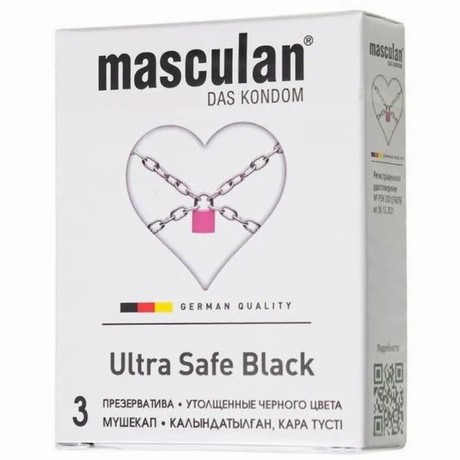 Masculan Ultra Safe Black – ультрапрочные презервативы классической формы черного цвета из утолщенного латекса для двойной защиты, без рельефных элементов. Отличное решение для анальной близости. Черный цвет, приятный запах. С гелем-лубрикантом и резервуаром. Из натурального латекса. Премиальное немецкое качество. Тестированы электроникой. Уровень качества подтвержден независимой голландской лабораторией и швейцарским знаком соответствия SGS. Толщина - 0,09 мм. Номинальная ширина - 53 мм. В упаковке - 3 шт.