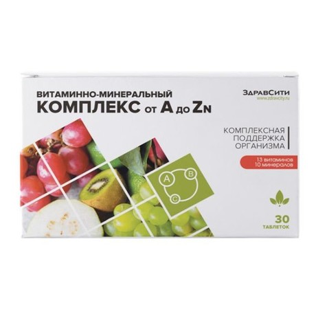 Активные вещества:Носитель: микрокристаллическая целлюлоза Е460 (i); кальция карбонат; магния оксид; аскорбиновая кислота; цинка цитрат; токоферола ацетат (DL-альфа-токоферола ацетат, крахмал модифицированный, мальтодекстрин, диоксид кремния аморфный); никотинамид; антислёживающий агент: тальк Е553 (iii); носитель: гидроксипропилметилцеллюлоза Е464; железо электролитическое; носители: кроскарамеллоза натрия Е468, мальтодекстрин Е1400; краситель Е171; ретинола ацетат; марганца сульфат; антислёживающий агент: диоксид кремния аморфный Е551; носитель: стеариновая кислота Е570; антислёживающий агент: магния стеарат Е470; влагоудерживающий агент: пропиленгликоль Е1520; кальция пантотенат; носители: поливинилпирролидон E1201, карбоксиметилцеллюлозы натриевая соль Е466; меди цитрат; фитоменадион; холекальциферол; пиридоксина гидрохлорид; тиамина гидрохлорид; рибофлавин; фолиевая кислота; хрома аспарагинат; калия йодат; натрия селенит; натрия молибдат; биотин; цианокобаламин.