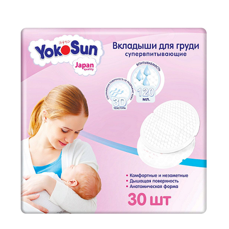 Вкладыши для груди YokoSun. Разработаны совместно со специалистами по грудному вскармливанию с учетом нежной кожи вокруг сосков кормящей мамы. Инновационный японский абсорбент в составе мгновенно впитывает влагу и удерживает ее внутри, не создавая парникового эффекта. Имеют анатомическую форму.