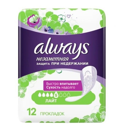 Бренд Always - является одним из мировых лидеров в производстве и продаже средств женской гигиены. ALWAYS НЕЗАМЕТНАЯ ПРОКЛАДКИ ЛАЙТ- для тех моментов, когда вам необходима дополнительная защита, есть прокладки Always «Незаметная защита при недержании». Впитываемость: 5 капель (из 8) Они впитывают в 3 раза больше жидкости, чем обычные ежедневные прокладки, и надолго сохраняют сухость. Кроме того, они оснащены технологией нейтрализации запаха, которая дарит непревзойденную свежесть и обеспечивает чувство уверенности. Попробуйте прокладки Always «Незаметная защита» для защиты при недержании. по сравнению с самыми популярными ежедневными прокладками в России