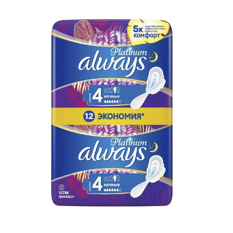 Always Platinum более комфортны (по сравнению с Always Ultra) благодаря тысячам микроподушечек и новым, мягким как шелк крылышкам. Они также обеспечивают лучшую защиту (по сравнению с Always Ultra) благодаря защитным боковым барьерам и ультравпитывающему внутреннему слою, который запирает влагу внутри. Always Platinum Ночные (Размер 4) с крылышками рекомендованы для ночного использования или для дневного использования при обильных выделениях.