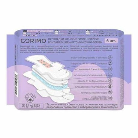 Гигиенические прокладки Соrimo подарят вам ощущения свежести и комфорта! Благодаря своему составу прокладки нежные и мягкие, поэтому не вызывают раздражения и не натирают. Надежно фиксируются на одежде с помощью анатомических крылышек, без протеканий.
