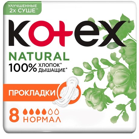 Бренд KOTEX - это бренд средств гигиены женщин в критические дни. Бренд принадлежит производственной компании Кимберли Кларк. Бренд гигиенической продукции марки очень разнообразен, что позволяет без труда подобрать подходящий именно для себя и конкретной ситуации вариант защиты. KOTEX ПРОКЛАДКИ NATURAL НОРМАЛ - прокладки санитарно-гигиенические разового использования Впитываемость: 4 капли (из 6) Женские гигиенические прокладки Kotex Natural НОРМАЛ Новые прокладки Kotex Natural НОРМАЛ для умеренных выделений обеспечивают комфорт и уверенность до 100%. 100% ХЛОПОК ГИПОАЛЛЕРГЕННО • дерматологически протестировано • 0% пластика, хлора, красителей в верхнем слое, соприкасающимся с твоей чувствительной кожей • Уникальный 3D центр - быстро впитывает • Прокладка лучше прилегает к телу - до 0% протеканий • Мягкие крылышки, надежно крепятся к белью и не натирают кожу • Эстетичная форма прокладки и нежный женственный дизайн добавят удовольствия при использовании Верхнее покрытие прокладки из 100% хлопка (за исключением крылышек). CPTC, Inc. NJ, США/А?Ш, Март/Наурыз/Березень 2020. ***Опрос потребителей. Россия. 2019. По сравнению с предыдущей линейкой Котекс® Ультра Нормал. Уникальный 3D центр - быстро впитывает