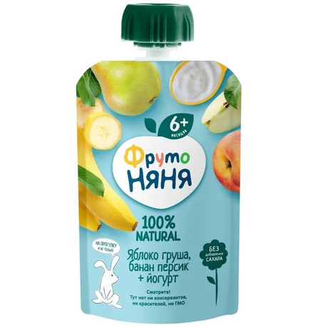 Пюре ФрутоНяня Яблоко Груша Банан Персик с йогуртом 90г – 100% натуральное лакомство, предназначенное для расширения рациона детей с 6 месяцев. Изготовлено на основе яблочного, грушевого, бананового и персикового пюре с добавлением нежного йогурта. Спелые сочные фрукты обогащают растущий организм витаминами, а йогурт способствует улучшению пищеварения и служит источником кальция. В составе нет сахара, крахмала, искусственных ароматизаторов, красителей, консервантов, ГМО. Продукт полностью готов к употреблению. Для перекуса вашему малышу не потребуется ложечка, ведь пюре можно кушать прямо из упаковки. Удобно брать с собой на прогулку, в гости, в дорогу. Разноцветные крышечки скрепляются между собой, превращаясь в увлекательный конструктор!